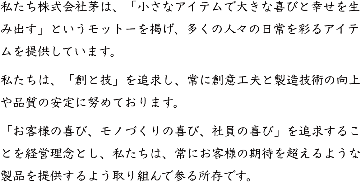 | 1981年07月 | 裂画(きれが)作家である大森麻紀永と生徒5人により裂画の魅力を生活小物に活かそうと創業。「株式会社 茅」を設立。ポーチやバッグ、トートバッグなどの様々な生活雑貨の生産体制を確立。自社ブランド品と提案型OEM生産を両立。 |